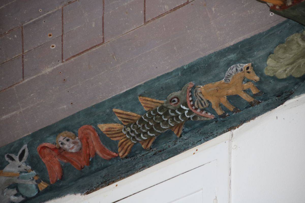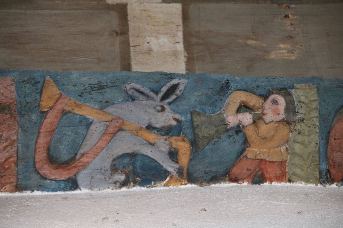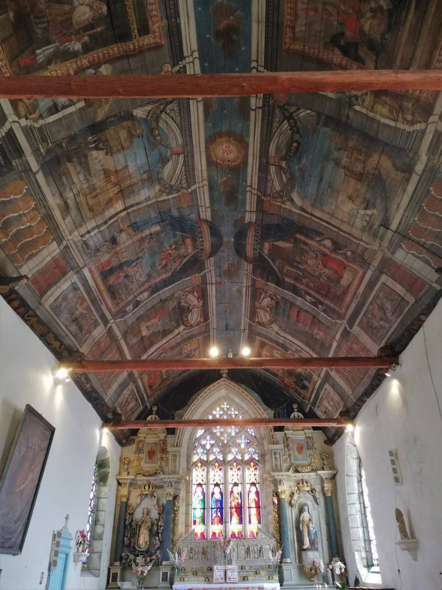 Les lambris de la nef, peints en 1716 par l’atelier Le Corre de Pontivy, retracent la vie de la Vierge. Les sablières et entraits (1652) présentent des scènes truculentes inspirées du quotidien, tel cet âne et sa cornemuse ou ce renard avec une andouille dans la gueule rappelant l’ancienneté de ce mets local.
