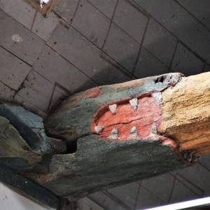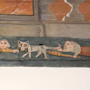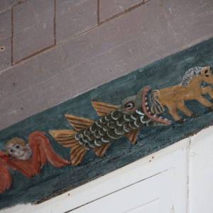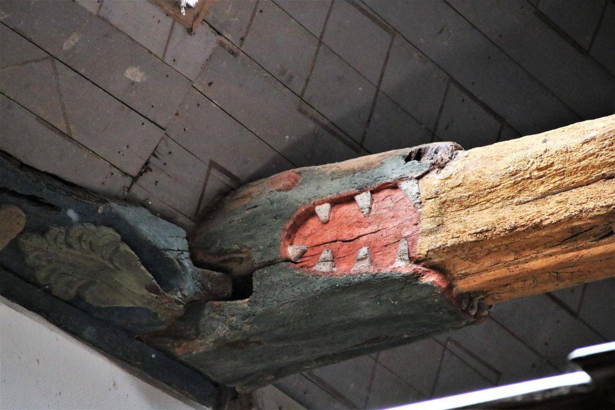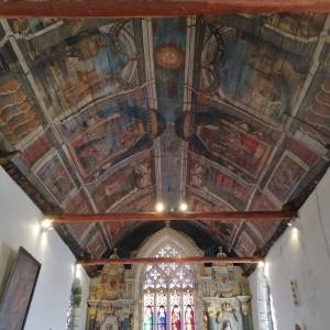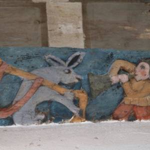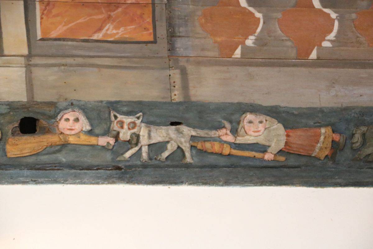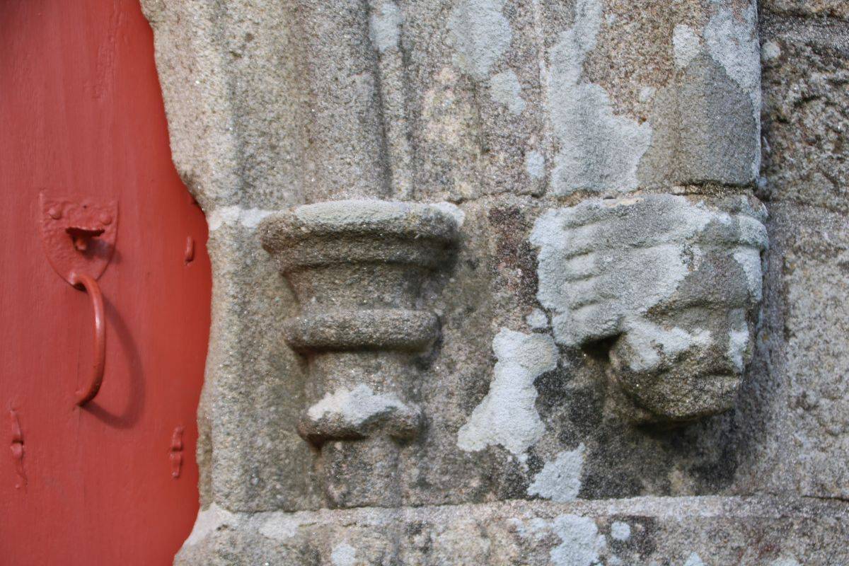 Les lambris de la nef, peints en 1716 par l’atelier Le Corre de Pontivy, retracent la vie de la Vierge. Les sablières et entraits (1652) présentent des scènes truculentes inspirées du quotidien, tel cet âne et sa cornemuse ou ce renard avec une andouille dans la gueule rappelant l’ancienneté de ce mets local.